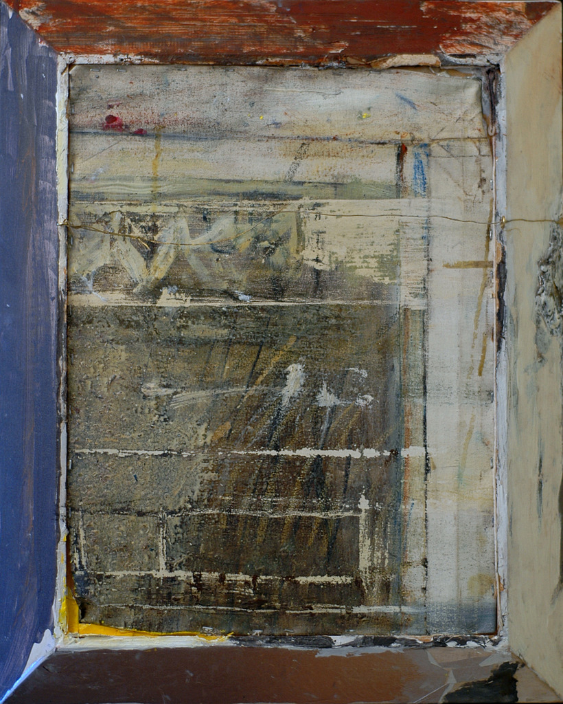 Window [front and reverse views] oil, acrylic, chalk pastel, charcoal and aluminum foil on canvas mounted on papier-mâché and wooden frame with metal wire. 2003-2008. Approx. 20”x 16”. Exhibited in The Storage Room and the Corridor, Deluge Contemporary Art, 2010