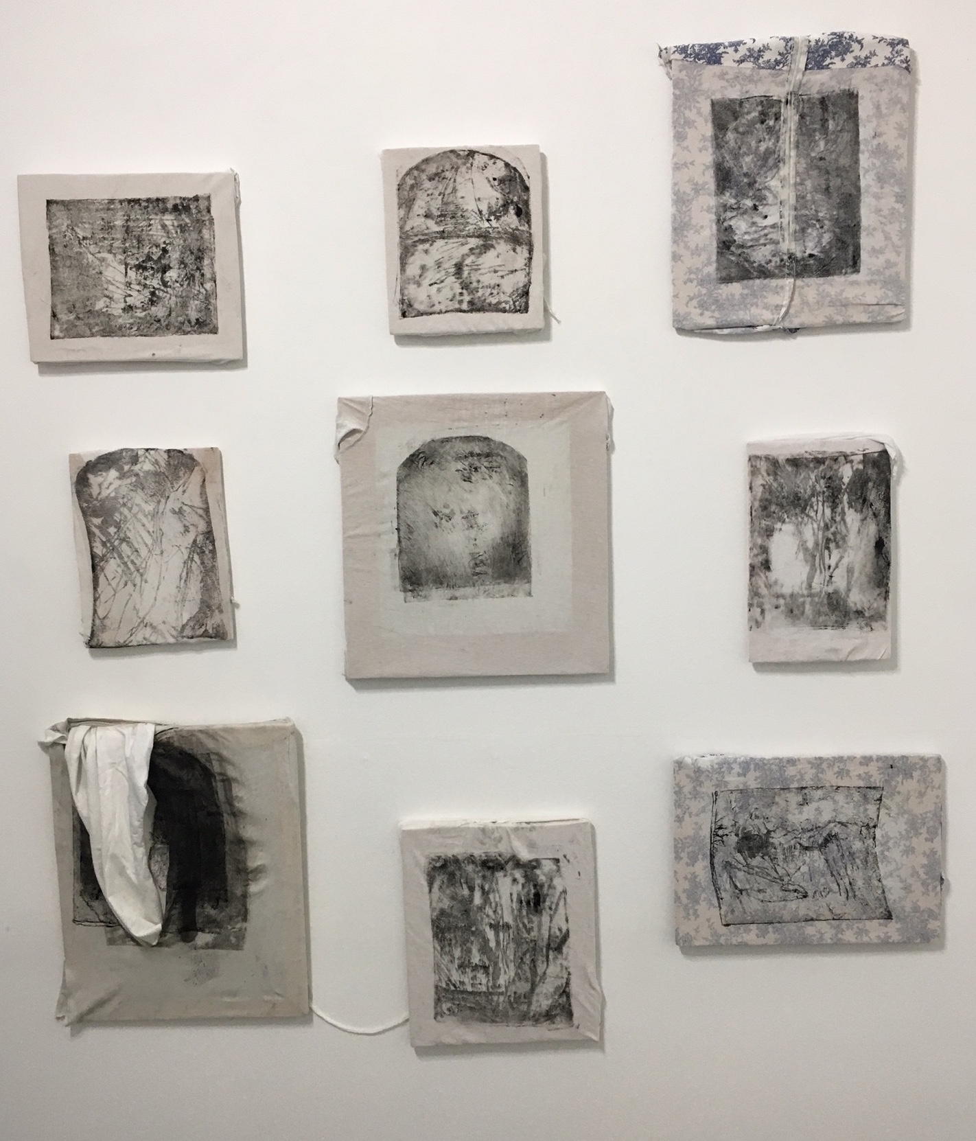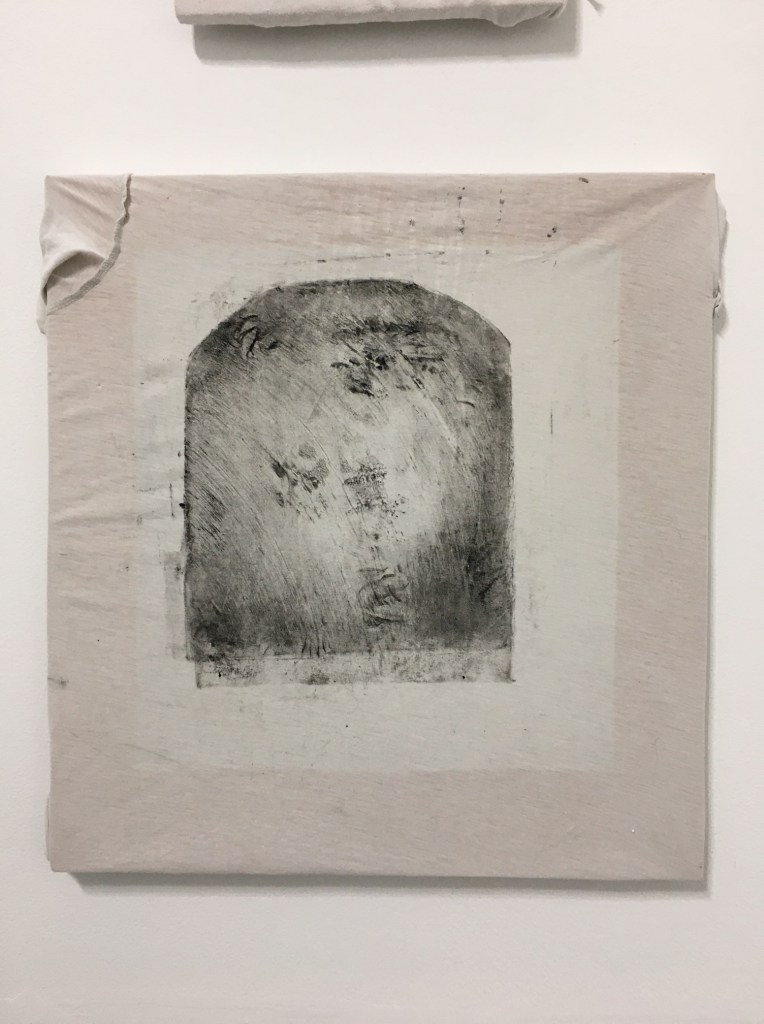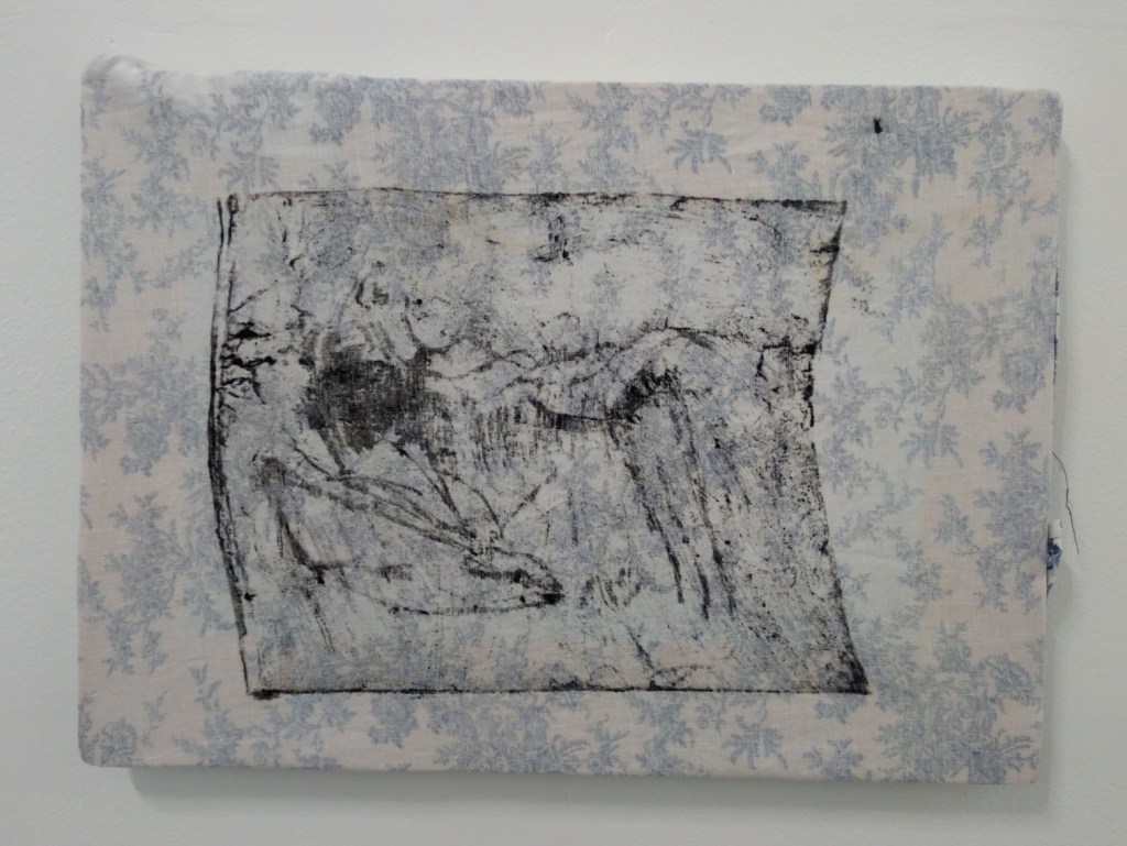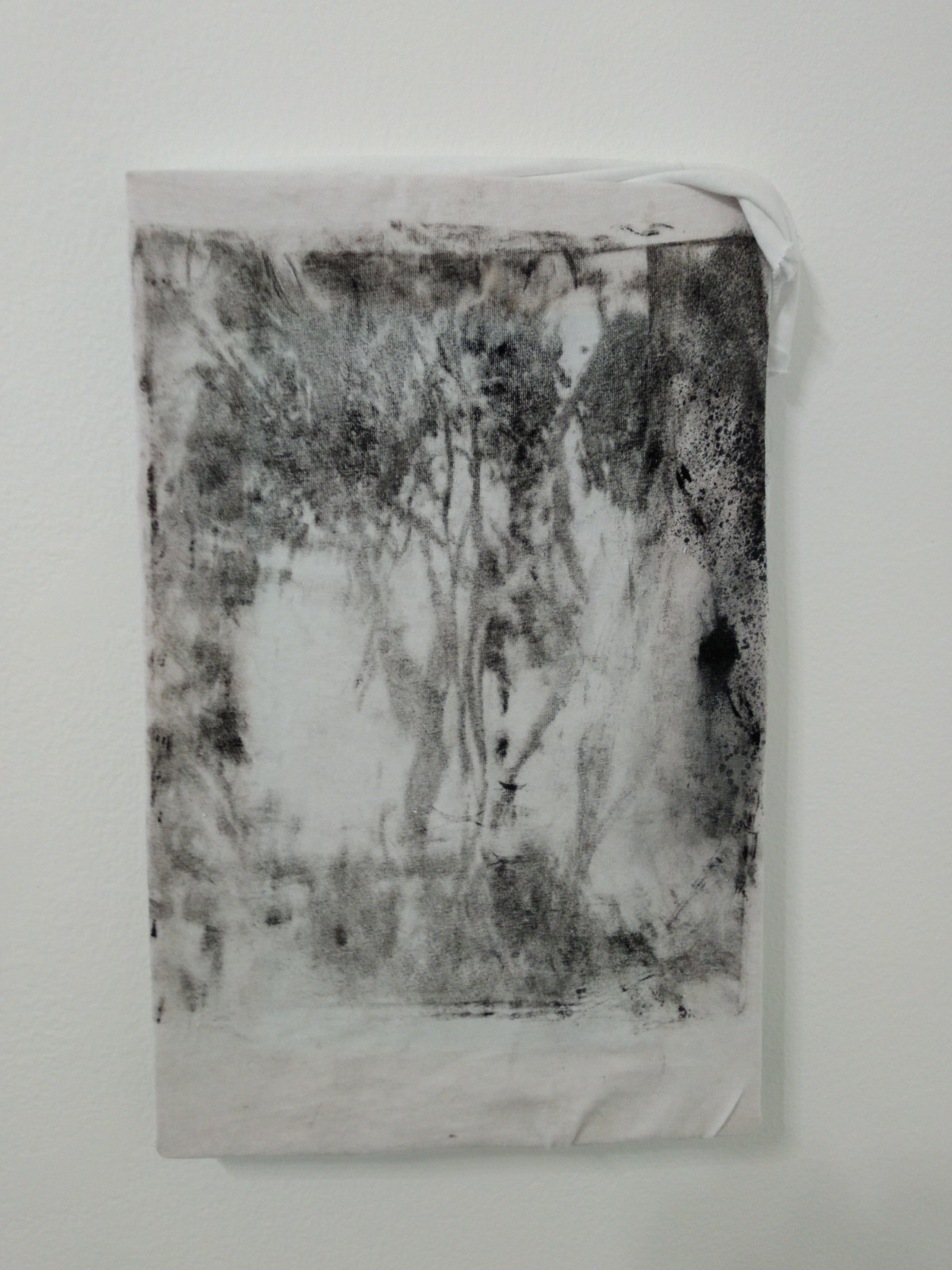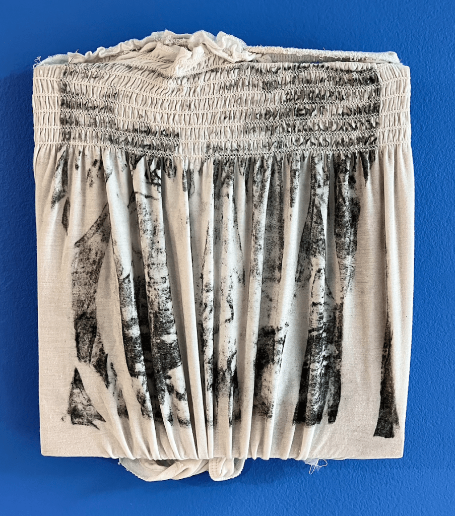 Untitled (the field gathered up), 2023, lithographic monoprint on found gathered cotton tunic approx 29 cm x 25 cm