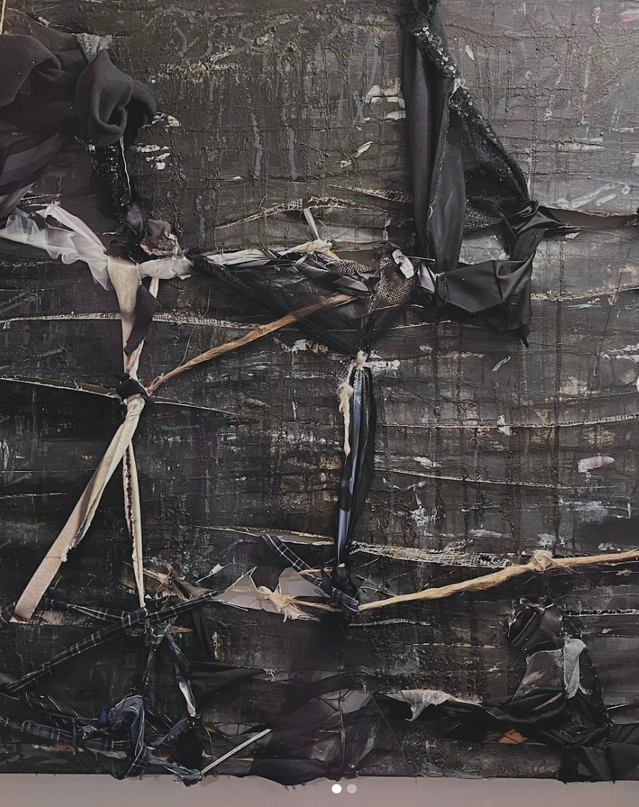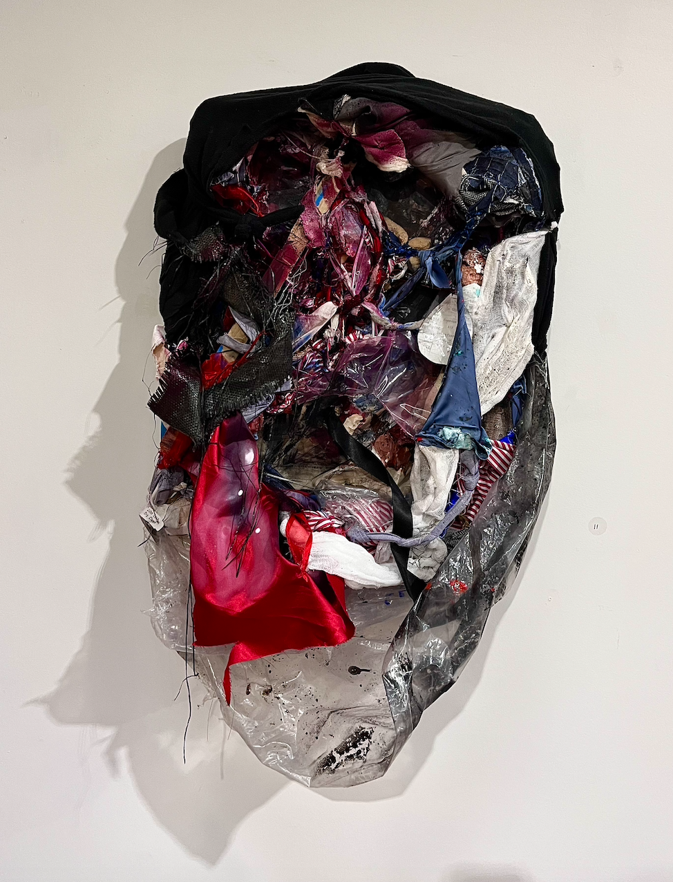 Ocean, they never were, 2002-2023, oil, acrylic, acrylic spray enamel, beeswax, charcoal, and chalk on collage on canvas and cheesecloth with wooden stretcher frame, silk necktie, metal wire, scraps of denim, nylon, tulle dress and sequined fabric, nylon tarpaulin, leather gloves, nylon reflective fabric tape, cotton oxford cloth shirt, and U.S. Army polar fleece blanket; mounted with paper and tape collage and straight pins, approx. 65 cm x 50 cm x 14 cm